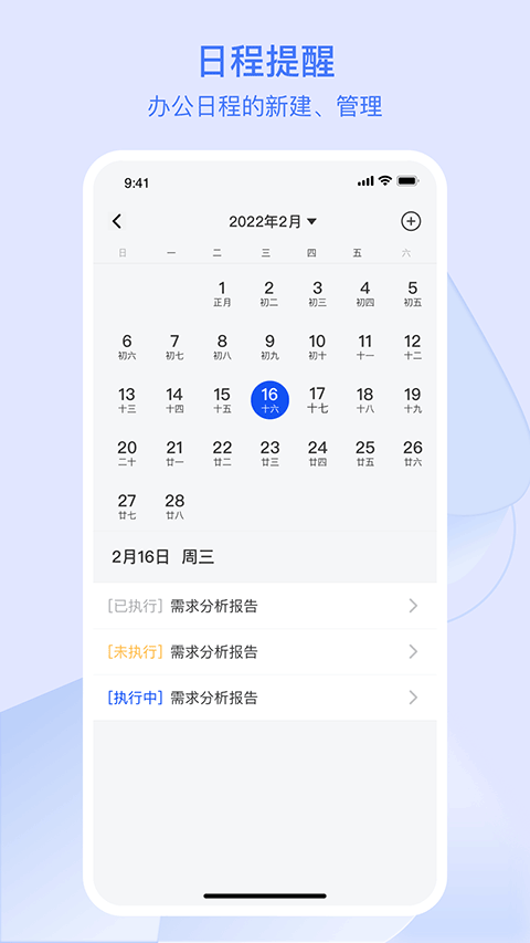 支持办公日程的新建、管理和提醒,帮助员工高效安排工作,避免遗漏重要事项。