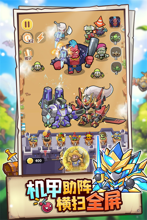 2、爆爽策略组合:运用植物的独特技能,搭配扭转战局的炫酷机甲清屏大招,体验策略与爽快并存的战斗。