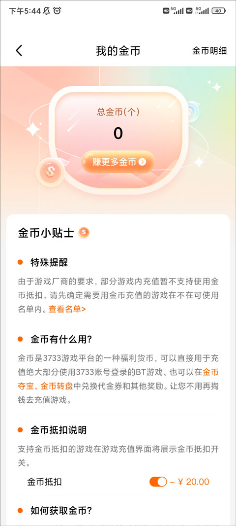 金币属于本平台的特殊货币。相较于平台币,作用更大,玩法更多。玩家可以通过完成任务、参加活动、充值等方式获得。金币可用于金币转盘抽奖活动,充值游戏时支付,兑换超值福利(1RMB=100金币)。