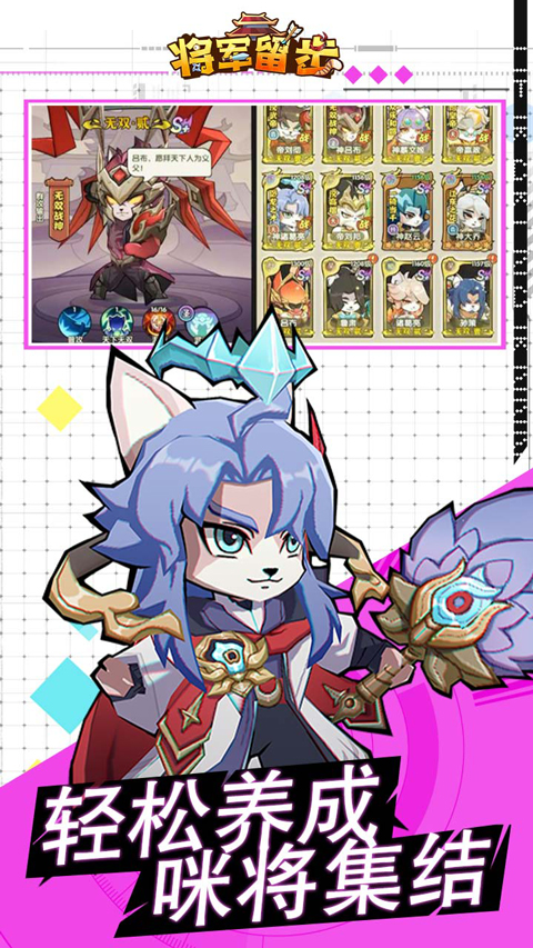 1、招募如忠勇无双的“赵云喵”、义薄云天的“关羽喵”、霸气侧漏的“吕布喵”,组建强大阵容。