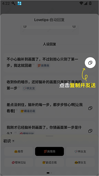 接着ai会给你很多回复的参考消息,你选择一个复制回复就行