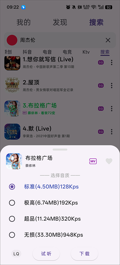 4、点击想要下载的歌曲,选中选项,这里可以看到多个音质的下载。