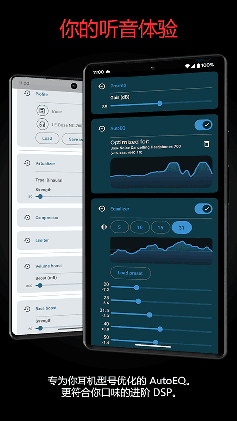 • AutoEQ 支持,包含超过 4000 种为不同耳机设备量身打造和定制的优化方案。