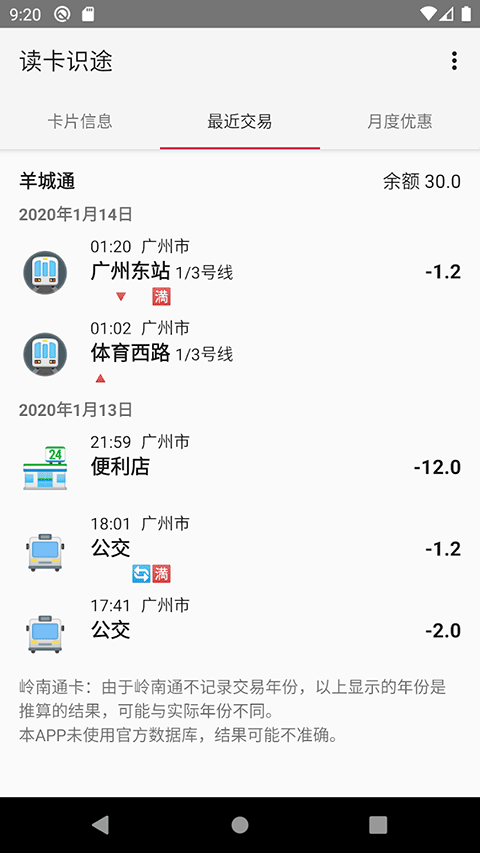 2、App将立即显示交通卡的实时余额和最近的消费记录,无需联网即可操作。