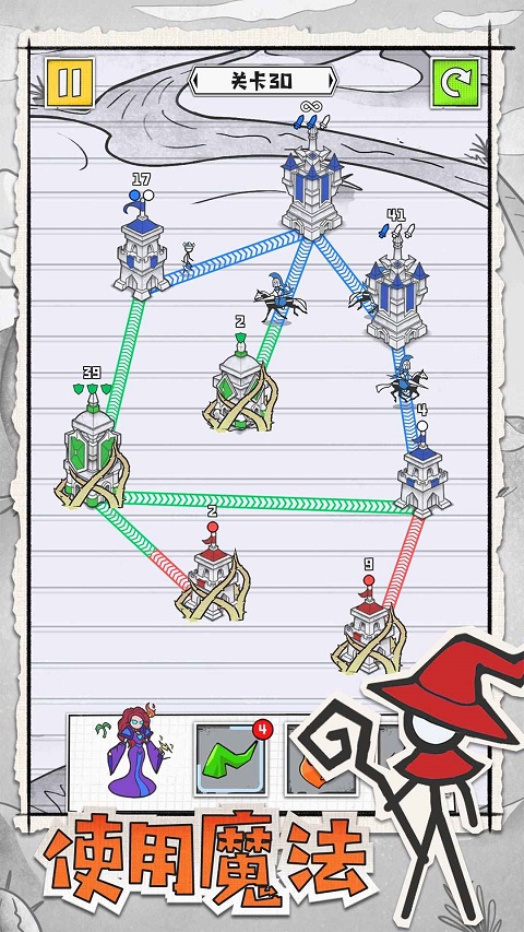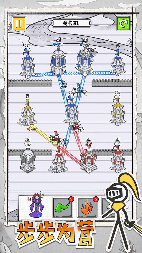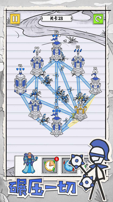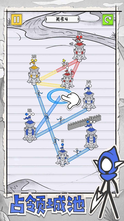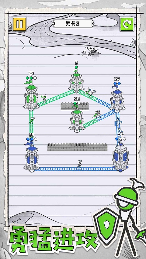 6、进化高级:当城堡到达高分时,会将接收的火柴人士兵派发出去