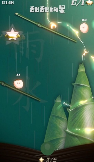 这一关里,我们需要经过最上方的竹竿的左侧,才能顺利下落而吃到星星,所以首先要登上右边最高的笋尖处。