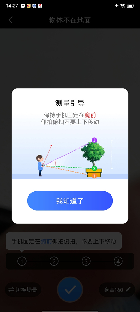 2、输入你的正确身高点击确定,记住在测量过程中需要把手机固定在胸前,不要摇晃或者上下移动。