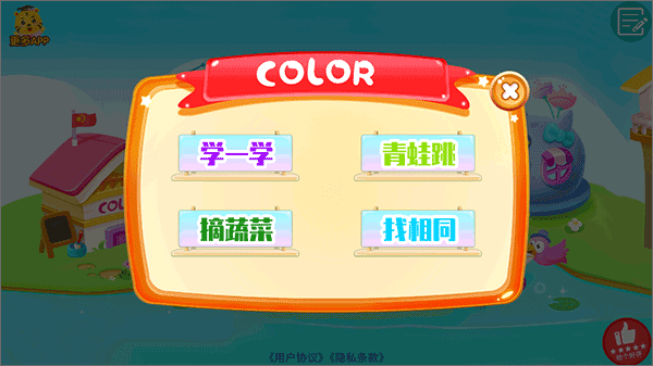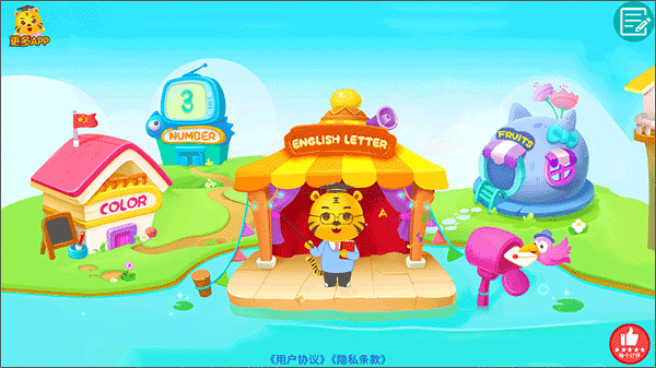 打开软件,小孩子们可以在这里进出不同的场景,针对场景中的学习内容做出不同的反应,软件展示的学习场景很多,专门针对幼龄阶段的小孩设计有一套完整的教学内容。为了让小孩能够清晰明了的学习好英语,软件还在配色上面下足了功夫,场景中的五颜六色的配色加上有趣的内容填充使得整个游戏非常受小孩子的喜欢,屏幕前的宝爸宝妈们,希望小孩能够早些接触英语、希望孩子能够对英语产生兴趣就快来下载这款游戏吧!