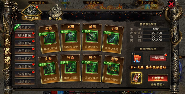 3、二大陆开始怪物稍微有点难度,之前建议多刷小怪凑齐一套装备后再去挑战BOSS,一定要记得完成每个大陆的兵器谱,可以白嫖红包和赞助卡,游戏内至尊赞助皆可通过收集兵器谱激活;