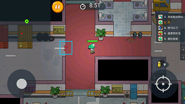 5、进入战场,左上角有小地图显示敌人位置,左下方是操作摇杆可以移动角色,右边是玩家排名,右下方按钮点击可以进行射击;