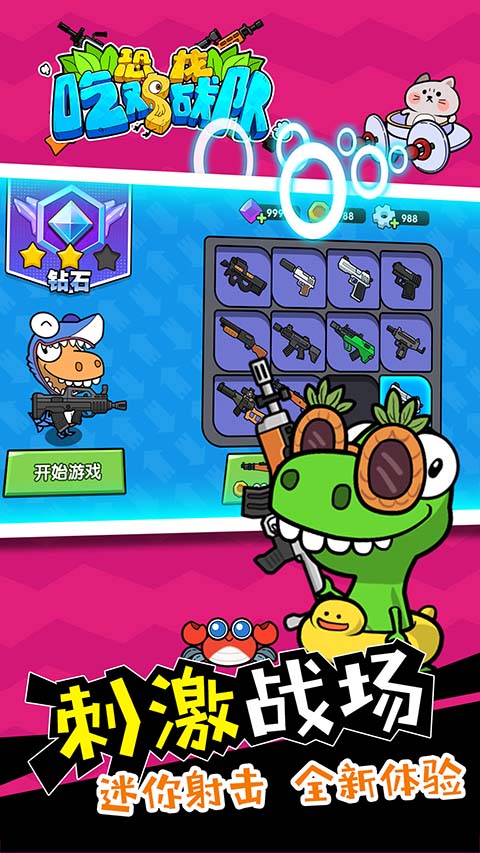 《恐龙吃鸡战队》是一款以恐龙为主题的2D吃鸡游戏,画面采用卡通Q版风格,玩家可以组建自己的恐龙战队,在战场上展开射击对决。游戏操作简单,玩家可以通过购买装备、合成武器来提升战斗力,还能选择不同角色和宠物,体验丰富的策略玩法。游戏内有多种地图模式和战斗模式,支持组队开黑或匹配陌生队友,让对战充满欢乐和惊喜。
