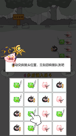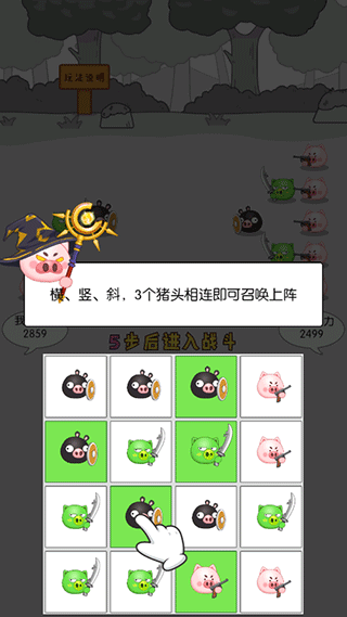 3、横、竖、斜3个猪头相连即可召唤上阵;