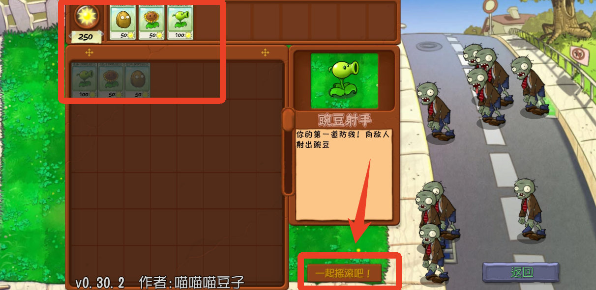 2、选择一个关卡之后再根据右边的僵尸选择需要上场的植物,点击下方的【一起摇滚吧!】就能开始游戏。