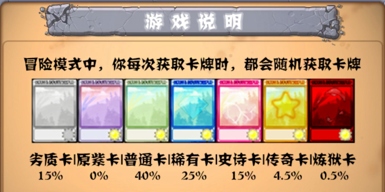 5、卡牌获取概率,如下图所示,只有在冒险模式才能获得卡牌哦。