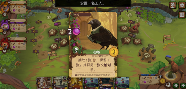 1、每回合玩家可采取三种行动之一,分别是放置工人收集浆果、树枝等资源和卡片;打出建筑和小动物卡;为下个赛季做准备。
