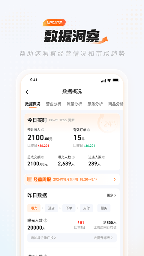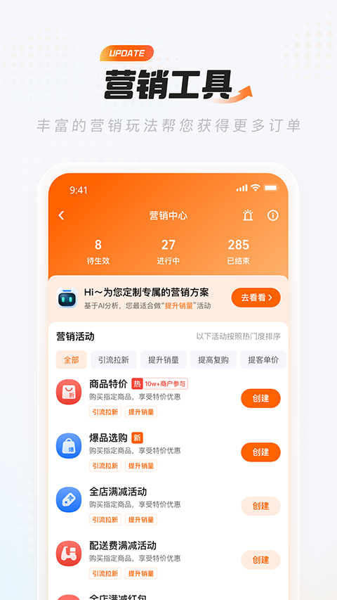 面向商家提供丰富的促销工具、数据分析,配置活动,订单飞涨!关注数据,事半功倍!