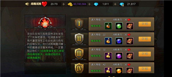 快带着你的战魂进入【战魂试炼】,有几率获得战魂技能书、战魂经验药水、战魂魂晶等。进入等级分为10级、22级、32级、42级、52级、62级直到最高102级。每个关卡每日有2次进入机会,每次消耗30体力,第一次打需要手动,之后可以扫荡即可,方便快捷,此试炼只要有体力应该无次数上限。
