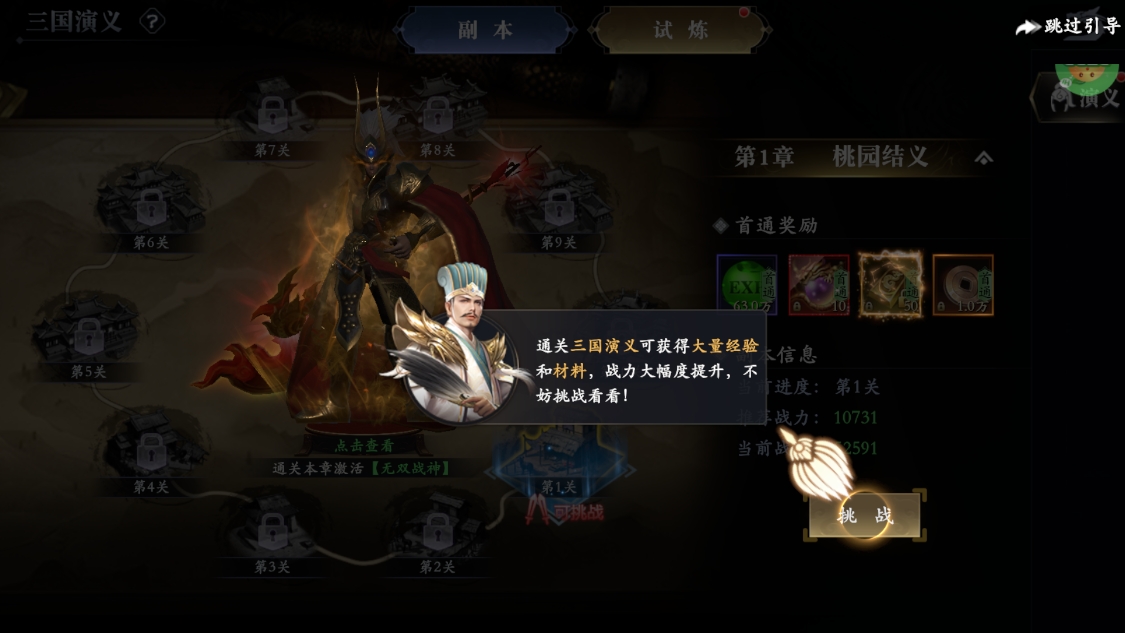 玩家通过完成任务和战斗来推进故事发展,感受三国时期的历史变迁。