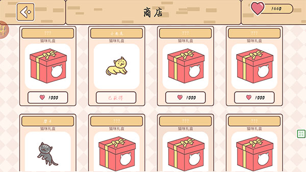 1、一开始的时候,玩家是默认拥有一只猫咪的,但是我们可以在商店里购买猫咪礼盒,这样就能拥有两只以及以上的猫咪了。