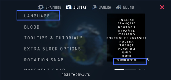 2、选择【DISPLAY】板块,在【LANGUAGE】处将语言切换为【台湾繁体中文】即可。