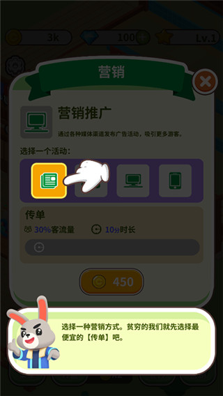 既然已经建造好了浴场,那么肯定是要招揽顾客的。所以我们要选择合适自己的营销方式来招揽顾客。前期不富裕的时候,只能选择最便宜的【传单】了,后面发展起来玩家就可任意选择了。