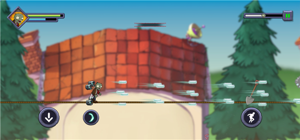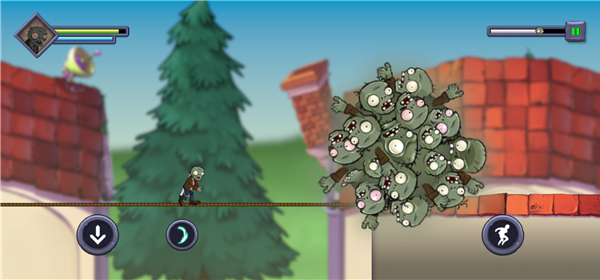 僵尸不能死手机版是《植物大战僵尸》的一款同人收集跑酷冒险闯关游戏,与《忍者必须死》玩法相似,玩家将操控僵尸在绳索上奔跑冒险,期间需要躲避大嘴花、铁锹等各种攻击,收集僵币,并尽量奔跑到关卡终点。僵尸不能死游戏采用关卡制玩法,每关都有三星目标,玩家需使用跳跃、冲刺等操作躲避障碍,用武器消灭三叶草、樱桃炸弹等植物,还可释放大招扫清前方,完成目标夺得金奖杯。随着游戏关卡的深入,僵尸的速度会逐渐增加,各种植物的攻击能力也会上升。