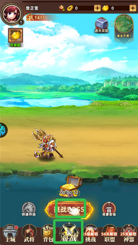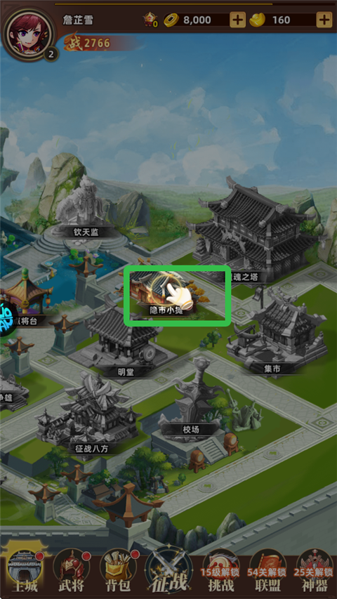 对于新手来说,第一步就是去酒馆招募冒险伙伴,然后点击招募按钮。接着在征战中挑战boss,点击武将头像让其上阵。主城里的隐市小筑还能购买各种道具,方便提升战力。