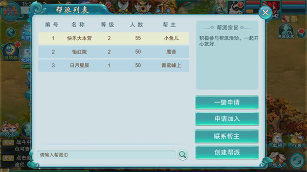 3、创建帮派:在帮派列表界面点击创建帮派,填入帮派名字并提交费用即可创建。