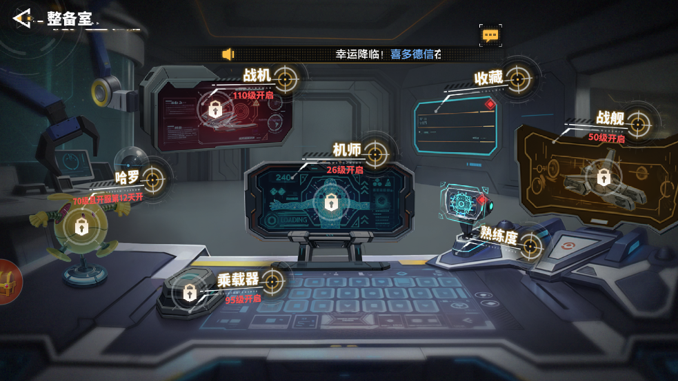 分哈罗、援军、战机、机师、熟练度、收藏、战舰七个选项,随着等级开放,通过培养对应的养成系统可以获得大量的属性加成