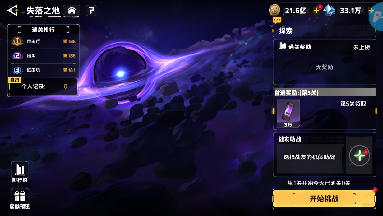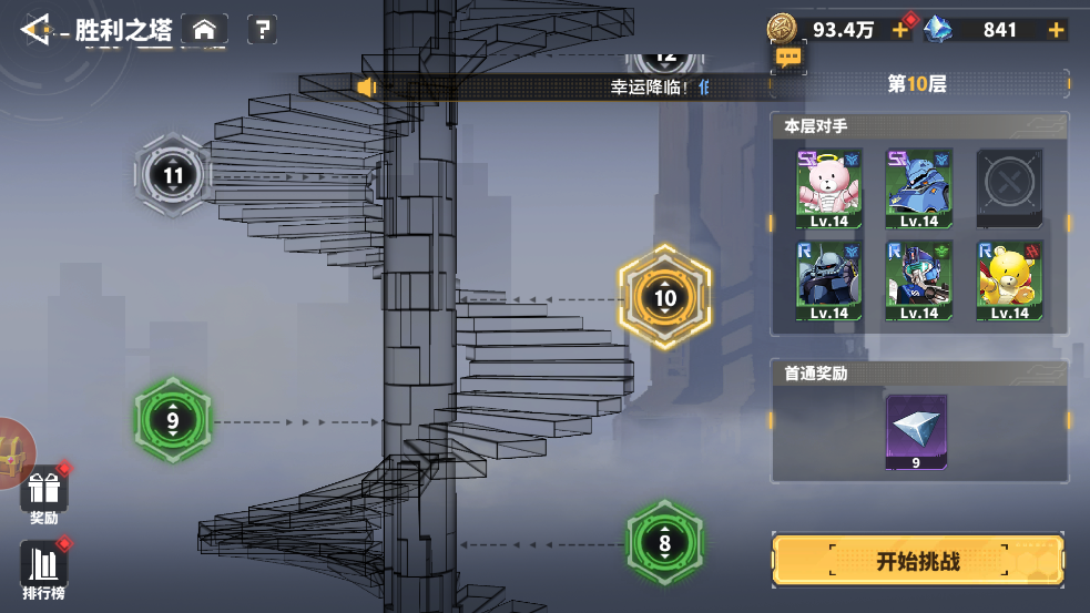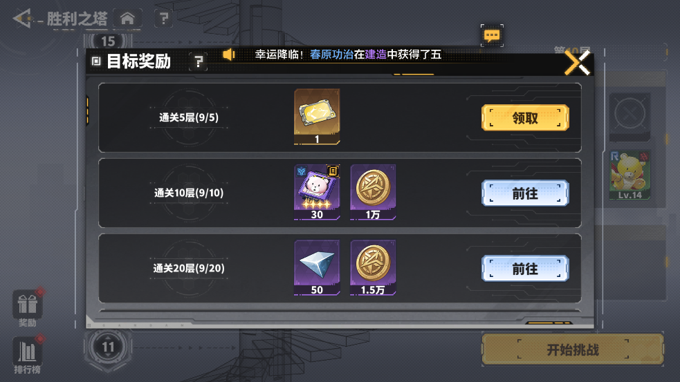 前期以推图升级为主,主线推到当日等级上限后开始打域外的胜利之塔,可以获得大量的机体养成资源及装备,层数越高奖励越好。