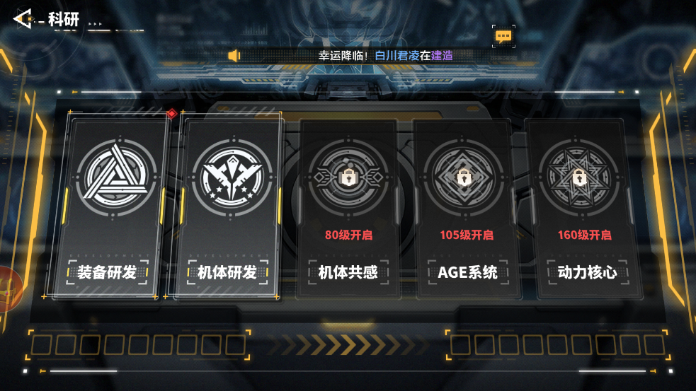 这里可以合成装备、芯片,升星机体,后续的养成玩法也会在这里开放。