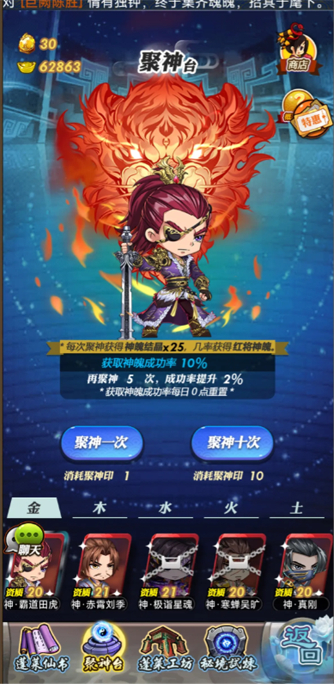 这卖买存赚,遇上神印活动,运气好还能倒赚元宝。所以不要浪费元宝直接去弄神将。