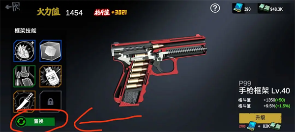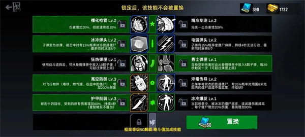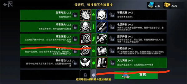 右边可以花费框架升级(满级50级),左边(置换)用框架刷技能(框架每升十级,就会解锁一个技能位(1级、10级、20级、30级、40级、50级各解锁一个))