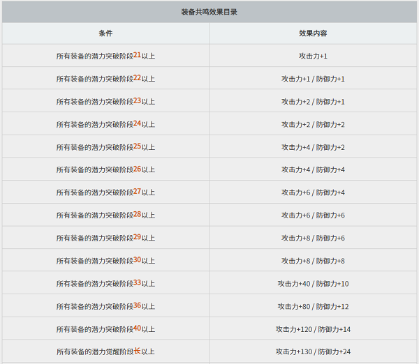 - 穿戴所有栏位的装备(主武器/辅助武器/头盔/盔甲/手套/鞋子6种)时,按照最低的潜力突破(潜力觉醒)阶段,可以获得额外战斗力。