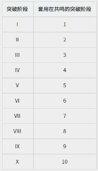- 装置在协调的炼金石的混沌炼金石: 突破、激烈、幸运从突破阶段I开始到X为止为套用共鸣对象,各突破阶段套用在共鸣等级的数值如下。