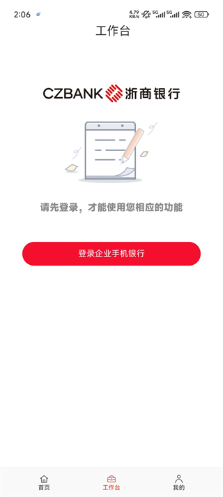 3、切换至【工作台】时,需先点击【登录企业手机银行】完成登录。登录成功后,即可使用对应的工作台功能进行业务处理与管理。