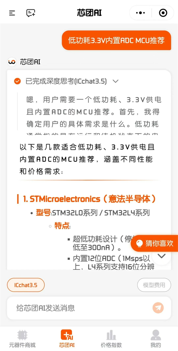 芯团AI在技术架构上创新性地实现“AI核心引擎”驱动,整合基于满血DeepSeek R1开源模型的自研模型“ICchat”。专注领域知识的深度训练和行业化适应,使其在电子元器件领域的专业能力远优于通用大模型,很好地解决了当前多数通用型AI平台因缺乏领域专业知识而存在的局限性。同时,芯团AI提供平滑的一站式服务平台,用户无需复杂的操作即可便捷调用多样化的模型资源,满足快速、优化、安全的需求。