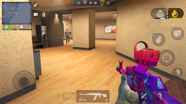 左侧遥感,右侧射击,瞄准、换弹、投雷、武器更换等一系列功能及操作中规中矩,适合绝大多数人的习惯,在一局有限的时间限定条件下,尽可能的击杀敌对势力获得积分,死后可以从基地复活,可与队友协同作战。