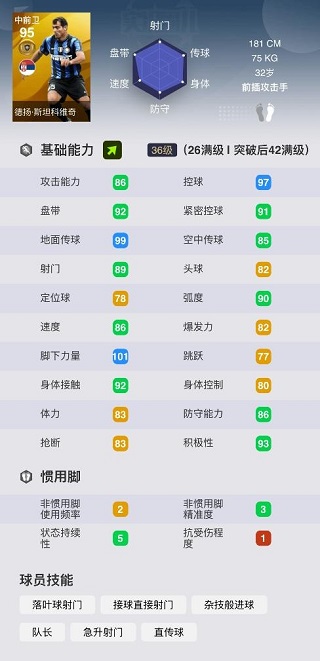 99的地面传球保障了他作为b2b不会失业,而89的射门和101的脚下力量让我们想起了那个以远射著称的铁人内德维德,可以说斯坦科维奇91的总评绝对是被严重低估的金球中场之一。