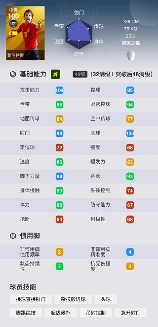 在替补上场后,莫伦特斯的速度来到了喜人的90,身体接触也会变成深绿,没有一个后卫会喜欢和这样一个大模型的中锋来一次贴贴。非惯用脚精度4让他可以左右开弓,接球直接射门、急升射门、杂技般进球和吊射,四个射门技能让他在剩余的时间里,要做的就是抓住机会起脚。