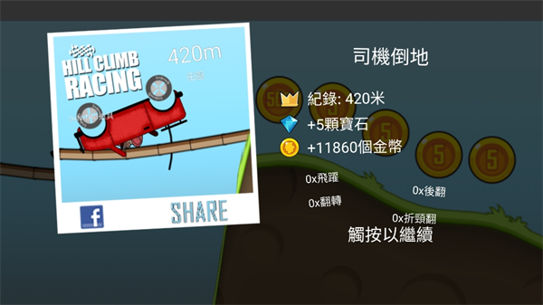 登山赛车(Hill Climb Racing)是由Fingersoft开发的一款基于真实物理引擎的山地赛车游戏。玩家通过控制油门和刹车,在不同地形中完成赛道、空中翻转和收集金币来获取资源,用于解锁新赛车或升级性能。