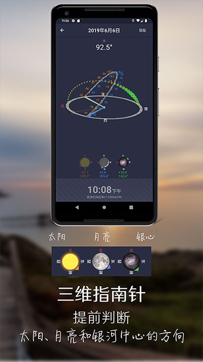 另外需要指出的是,该功能依赖于手机的方向传感器,而方向传感器有时候会受到周围环境磁场的干扰而不准确,安卓手机和苹果手机都有这个问题。因此,当你发现它指的不准的时候,不用奇怪。这个功能我一般只是作为一个参考。有时候拿着手机在空中划8字可以让传感器更准确些,但是不是绝对保证的。不过没有关系,只要现场可以看到太阳、月亮、或者星星,就可以判断出来手机指南针是否准确。如果不准,你就转8字,直到它准确,然后它指的未来时间的日月银河方向就会是准确的。