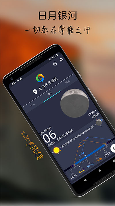 上面这个就是日月卡片,显示日月的仰角/时间曲线(橙色是太阳,蓝色是月亮,和专业版的用色一致)以及日月出落的时间和蓝调时间。从这张卡片,你可以清楚地看到今天的太阳月亮出落的先后顺序。不过大家可能好奇为什么要把蓝调时间单独列出来呢?因为这个时间对摄影师非常重要。原因有两个。蓝调时段的定义是太阳仰角在-4°到-8°之间,而这里显示的蓝调时间是太阳在-6°的时刻,是整个蓝调时段的最佳时刻。蓝调很适合风光摄影,这是原因之一。大家应该都知道日落和日出的光线最漂亮。如果云层的高度和距离合适,在日落之后,还可能有二次火烧云。日出之前也是一样。而这个蓝调时间就是最早(日出之前)或者最迟(日落之后)可能出现火烧云的时间。换句话说,如果你打算早起拍日出,最好在给出的蓝调时间之前就到达拍摄机位;如果拍日落,就等到过了给出的蓝调时间以后再离开。这样才能不错过日出日落最辉煌的时刻,这是原因之二。