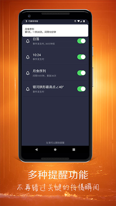 风光摄影师的追光之路其实就是抓住诸如太阳、月亮、银河星辰等等这些自然光所带来的光线的独特角度或者它们更好在某个位置的最佳瞬间。这些瞬间是非常短暂的,让摄影师在现场没有时间慢慢去操控手机,为此PlanIt Photo Inc公司又推出了巧摄现场版app,该软件操作界面十分简单,它只显示你的当前位置的昨天、今天和明天三天的信息,重要事件会通过三个卡片显示出来,第一个是月相日历卡片,第二个是日月卡片,第三个是银河卡片。而且现场版就两个操作:上下滑动看该天的三张卡片,左右滑动看昨天、今天和明天的情况。这个功能让你大部分情况下可能都不需要按任何一个按钮就可以看到需要的数据,甚至有智能手表的用户都不需要打开手机。