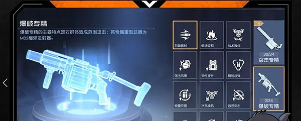 例如,突击专精对应着M134重型机枪;爆破专精对应着M32榴弹发射器;辅助专精对应着B39生化步枪。