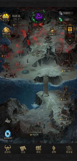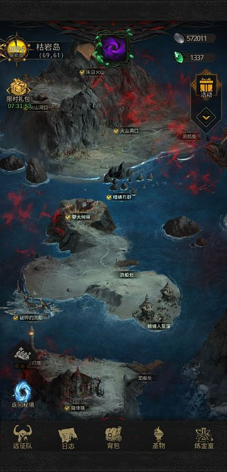 枯岩岛分为一个主岛加4个小岛,开局先把主岛跟南方的小岛的小关全打了,尤其是拿到伐木场的木材要拿到。把篝火旁的鱼人都干掉,跟篝火对话,这时要渡海去西北方的小岛打通火山。