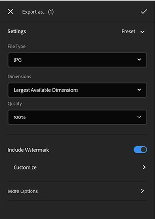 选择预设选项以将您的照片快速导出为 JPG(小)、JPG(大)或原始图像。