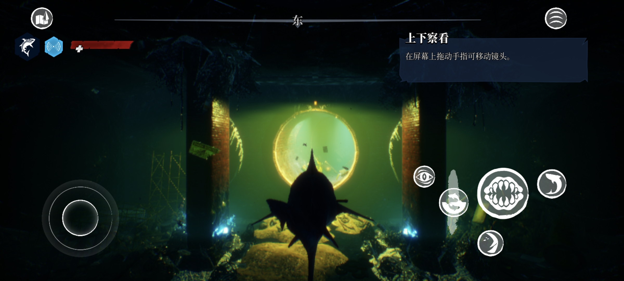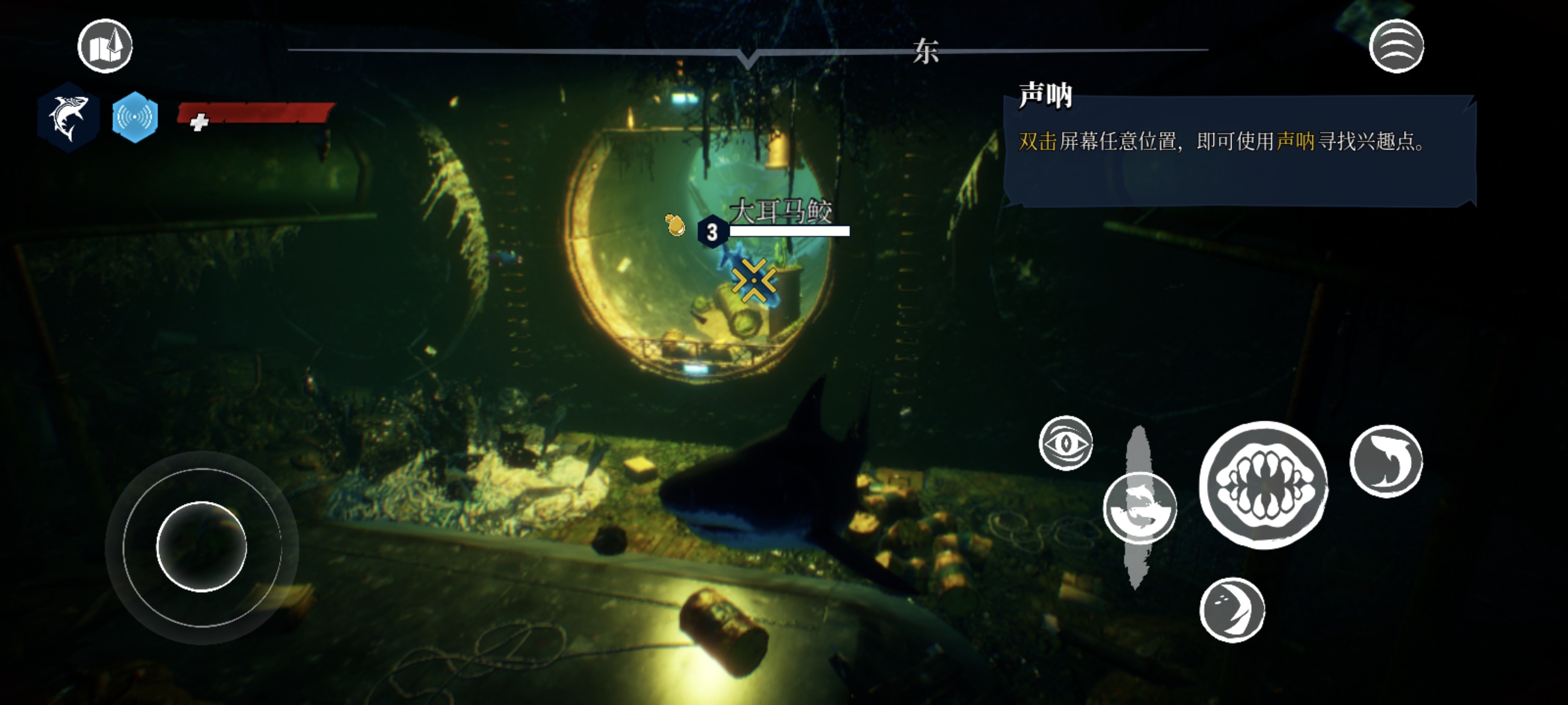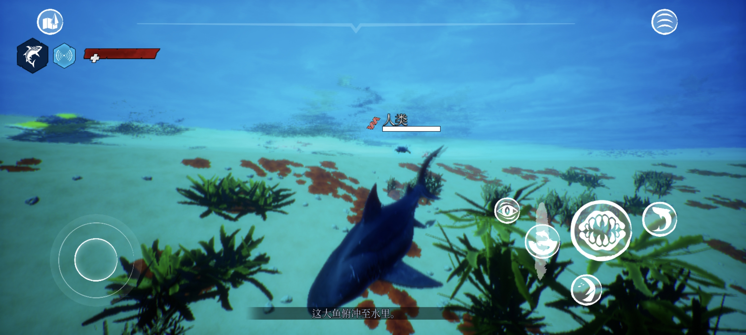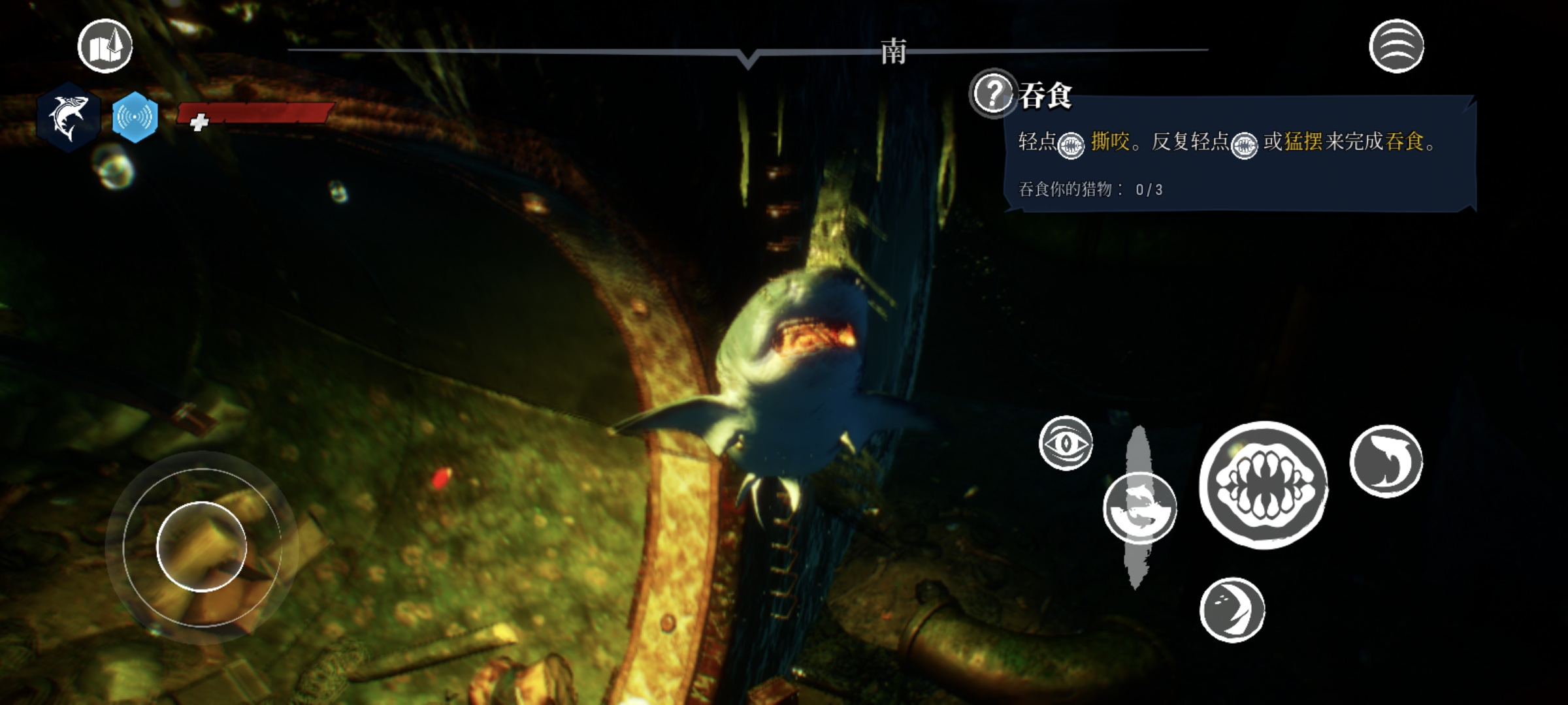 3、通过摇杆即可控制食人鲨的移动方向,不过感觉移动端的适配优化不是很好,操作不是很丝滑,有些生硬。