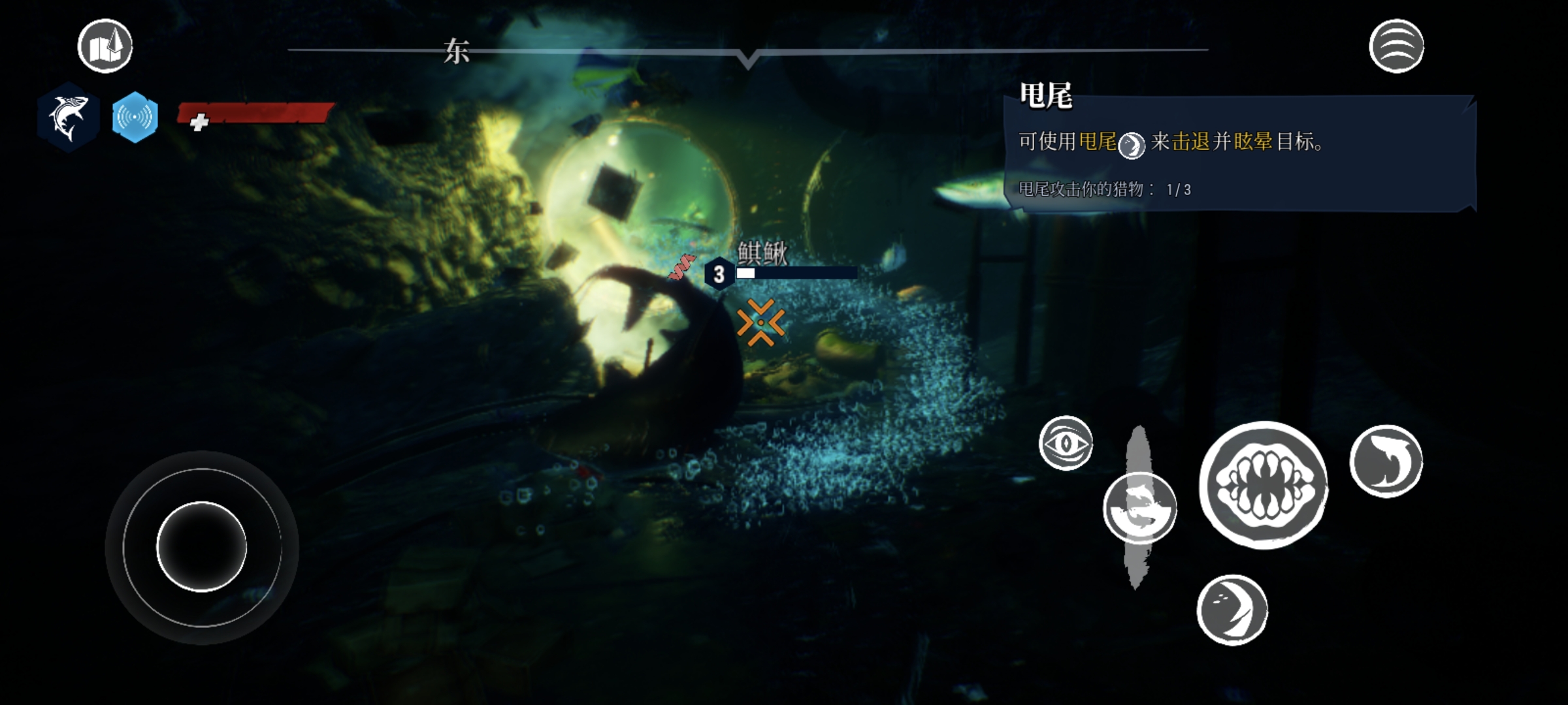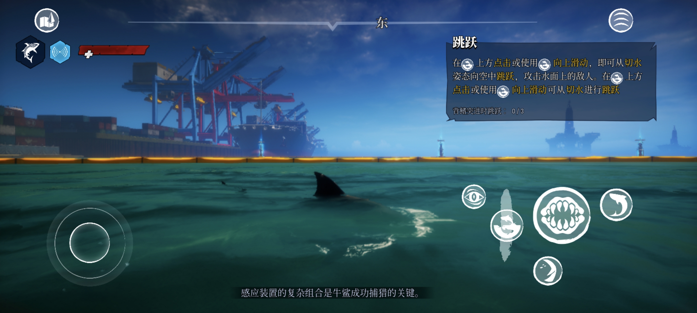 9、在游出水面后,可以点击撕咬下方的按钮,触发“背鳍突进”