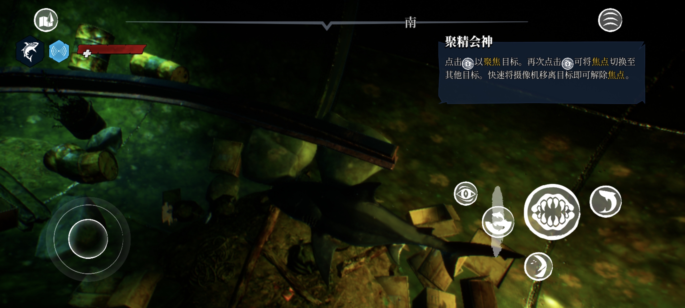 5、点击图中眼睛的按钮,可以使用“聚精会神”,会自动把食人鲨的朝向对准猎物,这也是提高捕猎的一大有力手段。